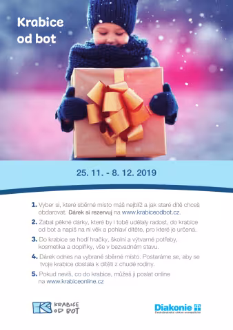OSPOD Stříbro a Tachov a neziskové organizace shromáždily seznam 70 dětí. Na webu https://www.krabiceodbot.cz/sberne-misto/36/farni-sbor-cce-ve-stribre/ zvolte, jaký dárek vyrobíte a od 25.11., ale především 1.12. na adventním koncertu se těšíme, až nám krabice přinesete!